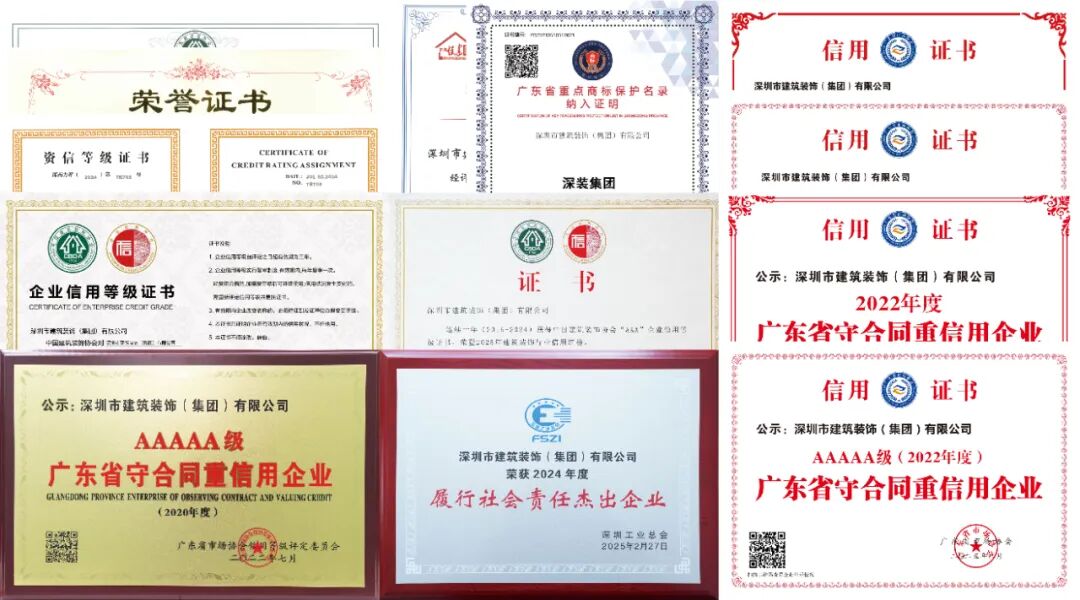 深裝集團(tuán)自成立以來,以服務(wù)城市建設(shè)大局為己任,在人才培育、科技創(chuàng)新、質(zhì)量管控、責(zé)任踐行等領(lǐng)域持續(xù)發(fā)力,始終將誠信建設(shè)作為企業(yè)發(fā)展生命線,嚴(yán)格遵守國家法律法規(guī)與行業(yè)規(guī)范,先后榮獲“新時代企業(yè)誠信文化先進(jìn)單位”“企業(yè)信用AAA等級證書”“資信AAA等級證書”“履行社會責(zé)任杰出企業(yè)”“5A級廣東省守合同重信用企業(yè)”“廣東省誠信經(jīng)營企業(yè)”“廣東省重點商標(biāo)保護(hù)名錄”“首批質(zhì)量信譽(yù)服務(wù)承諾企業(yè)”“項目投標(biāo)資格信用等級證書”“羅湖區(qū)建筑市場誠信優(yōu)質(zhì)企業(yè)”等殊榮,實現(xiàn)經(jīng)濟(jì)效益與社會效益共生發(fā)展,獲社會各界認(rèn)可。