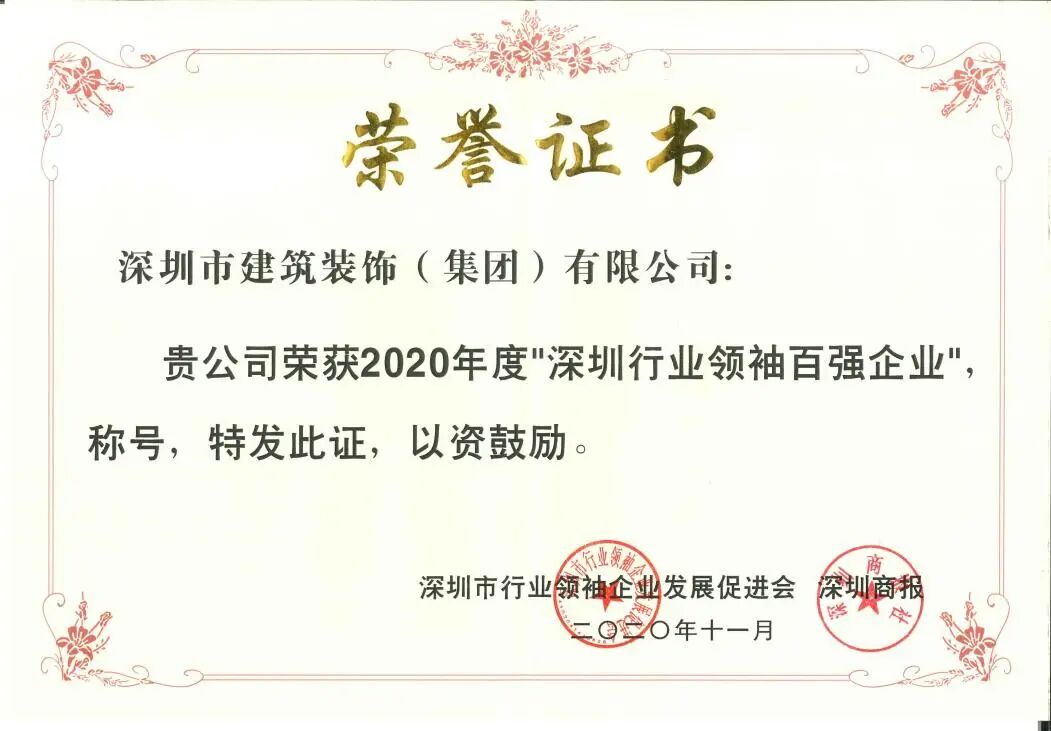 會上,深裝集團(tuán)榮獲“2020深圳行業(yè)領(lǐng)袖企業(yè)100強(qiáng)”。