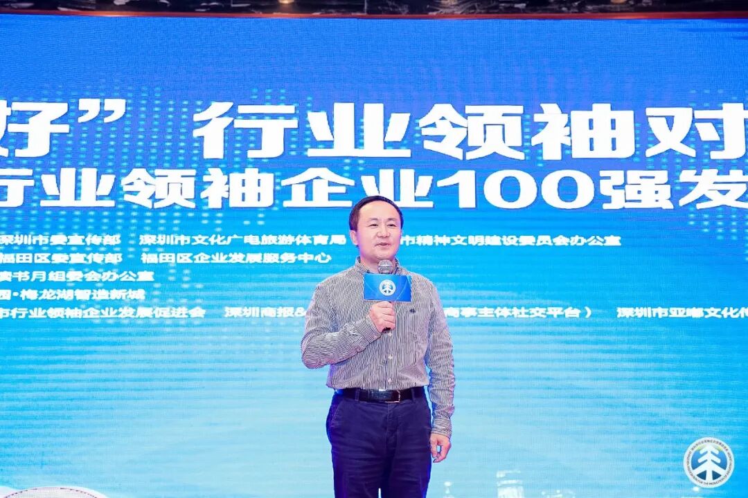 會上,深圳市行業(yè)領(lǐng)袖企業(yè)發(fā)展促進(jìn)會執(zhí)行會長,深裝集團(tuán)黨委書記、董事長、總裁吳富貴代表活動組委會致辭。他說,深圳市行業(yè)領(lǐng)袖企業(yè)發(fā)展促進(jìn)會是由深圳百強(qiáng)企業(yè)、行業(yè)領(lǐng)軍企業(yè)家發(fā)起成立,以“構(gòu)建互益平臺、深化行業(yè)合作”為使命,確立“4+1”服務(wù)體系,持續(xù)推動實(shí)踐型、創(chuàng)新型和學(xué)習(xí)型組織建設(shè)。深圳讀書月期間,促進(jìn)會有幸與《深圳商報(bào)》&讀創(chuàng)(深圳300萬商事主體社交平臺)再度攜手,共同承辦第二屆行業(yè)領(lǐng)袖對話讀書月暨行業(yè)領(lǐng)袖企業(yè)100強(qiáng)發(fā)布,活動意義重大、影響深遠(yuǎn)。他與現(xiàn)場嘉賓分享了三點(diǎn)讀書體會:一是好讀書、讀好書。作為新時(shí)代的企業(yè)家,要帶頭多讀書、讀好書,發(fā)揮企業(yè)家領(lǐng)讀領(lǐng)教知識經(jīng)驗(yàn)和示范帶動優(yōu)勢,大力推動學(xué)習(xí)型組織建設(shè),動員企業(yè)全員閱讀,進(jìn)而引領(lǐng)帶動社會全民閱讀。二是善學(xué)習(xí)、愛學(xué)習(xí)。作為新時(shí)代的企業(yè)家,應(yīng)具備嶄新的精神風(fēng)貌,不僅要有不怕困難、百折不撓的創(chuàng)業(yè)精神,還要有如饑似渴、不知疲倦的學(xué)習(xí)精神;不但要做物質(zhì)財(cái)富的創(chuàng)造者,還要做精神文明的推動者,努力成為有使命擔(dān)當(dāng)、有家國情懷、受人尊敬的企業(yè)家。三是探新知、重實(shí)踐。作為新時(shí)代的企業(yè)家,要深入學(xué)習(xí)貫徹習(xí)近平新時(shí)代中國特色社會主義思想,學(xué)習(xí)古今中外優(yōu)秀傳統(tǒng)文化,學(xué)習(xí)信息科技人工智能最新知識,自覺踐行習(xí)總書記在深圳特區(qū)成立40周年大會上的講話精神,永葆“闖”的精神、“創(chuàng)”的勁頭、“干”的作風(fēng),持之以恒、不斷學(xué)習(xí),為全面建設(shè)社會主義現(xiàn)代化國家貢獻(xiàn)自己的智慧和力量。
